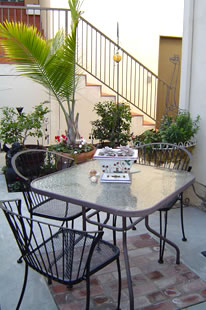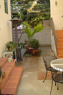 Mar Vista 1- This landscape design in Mar Vista needed a backyard patio to tie together two seating areas. This was accomplished by using bricks within the concrete.